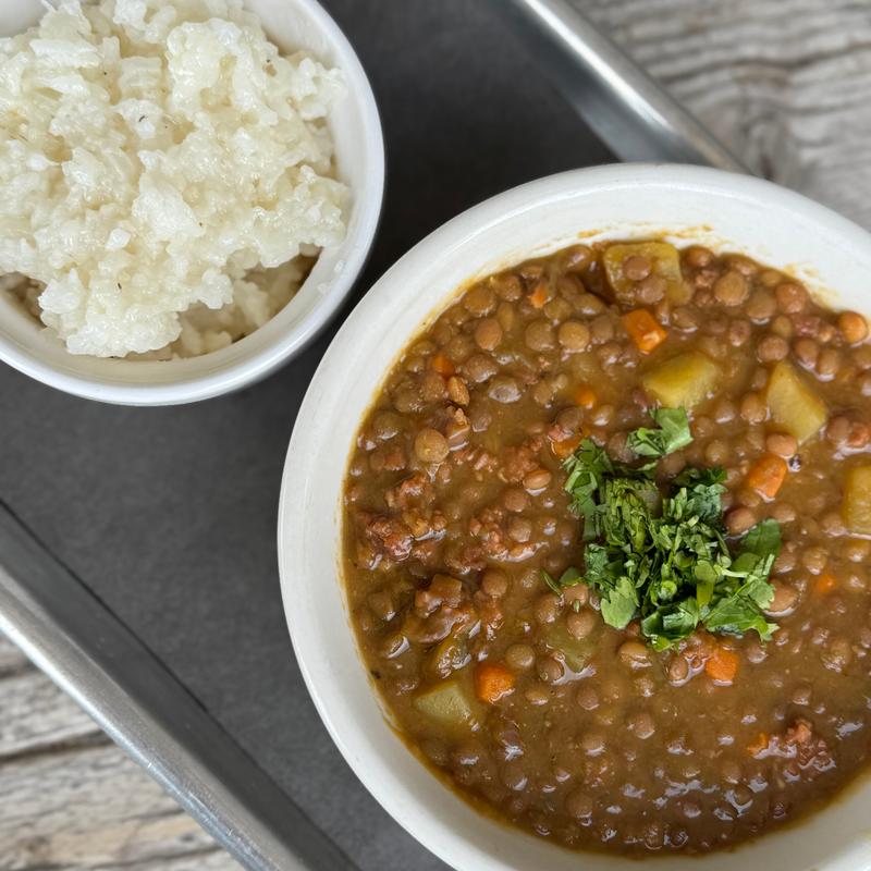 Slow-cooked lentils with veggies, jalapeños, chorizo & jasmine rice.