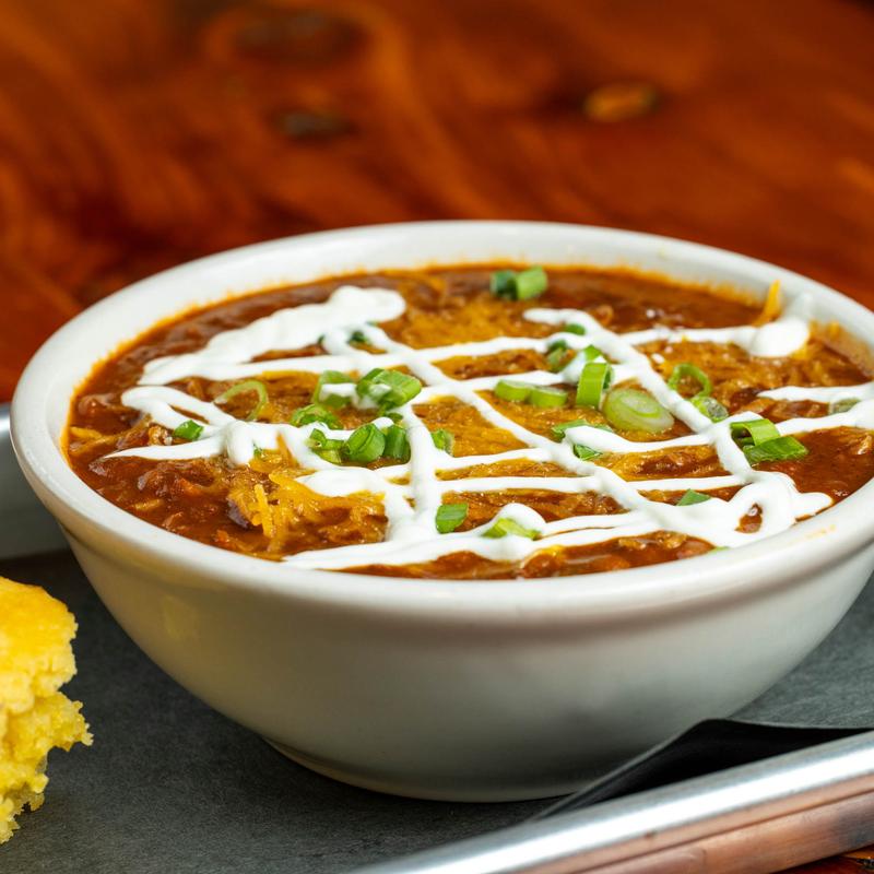 Topped with sour cream, cheddar & green onions. Served with cornbread & honey butter.